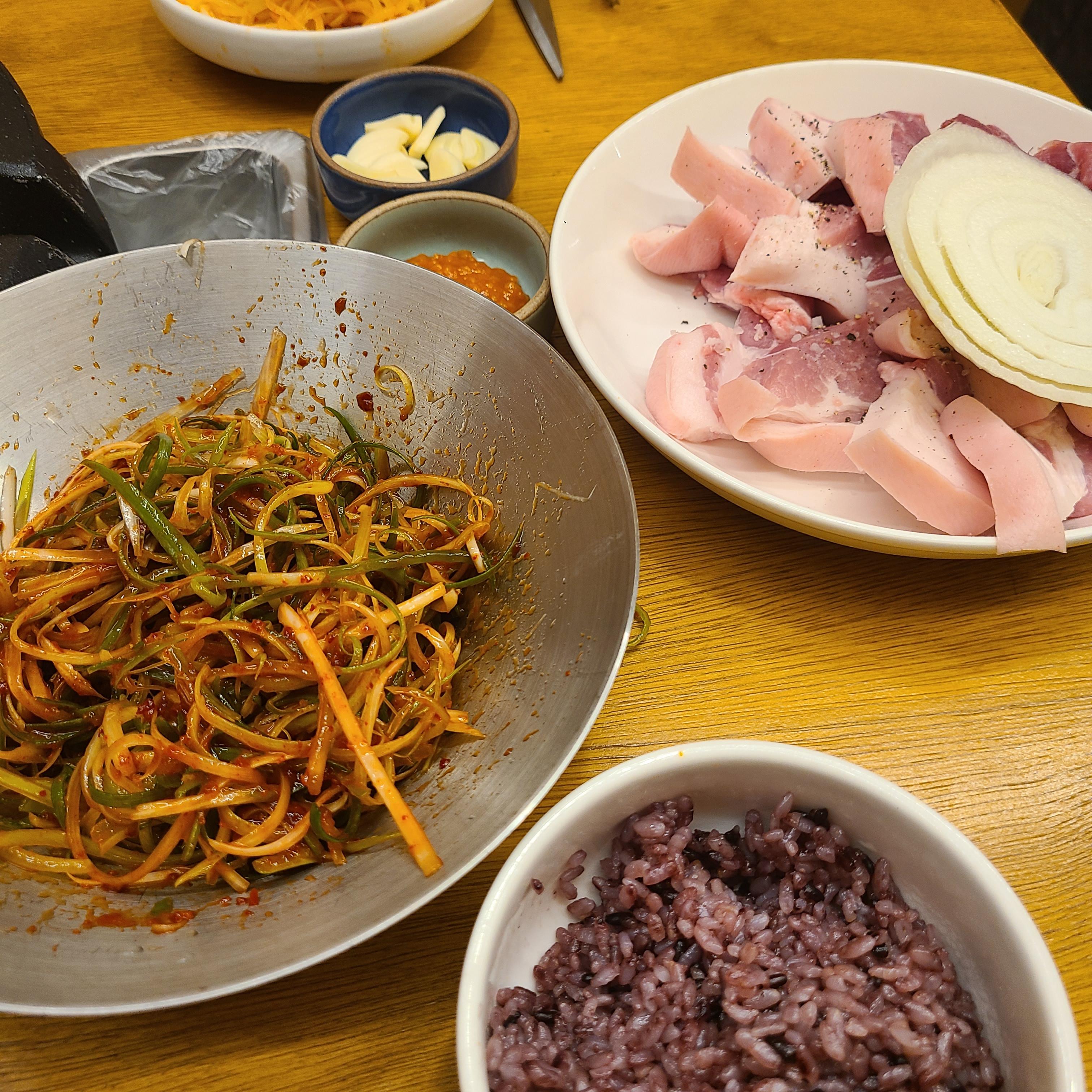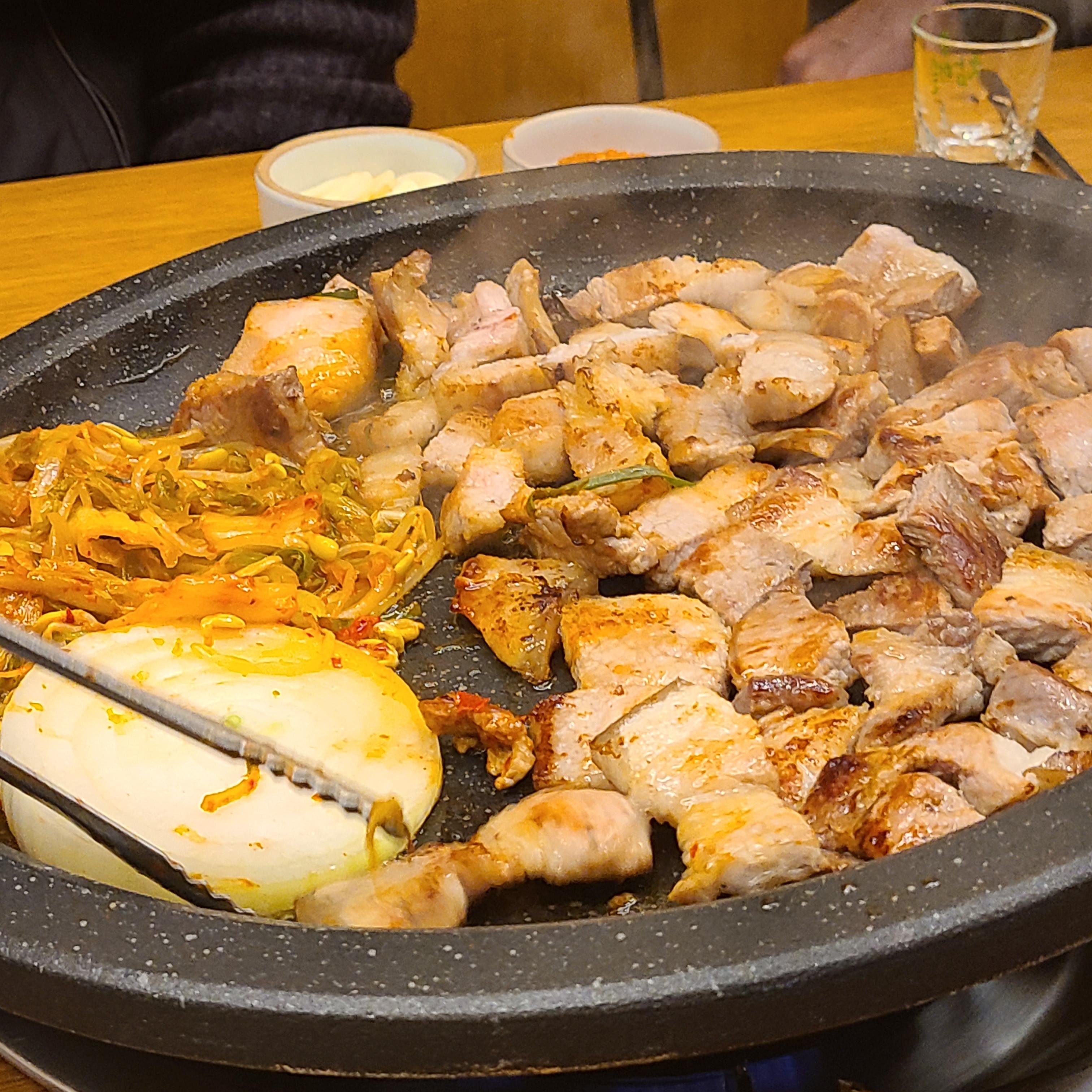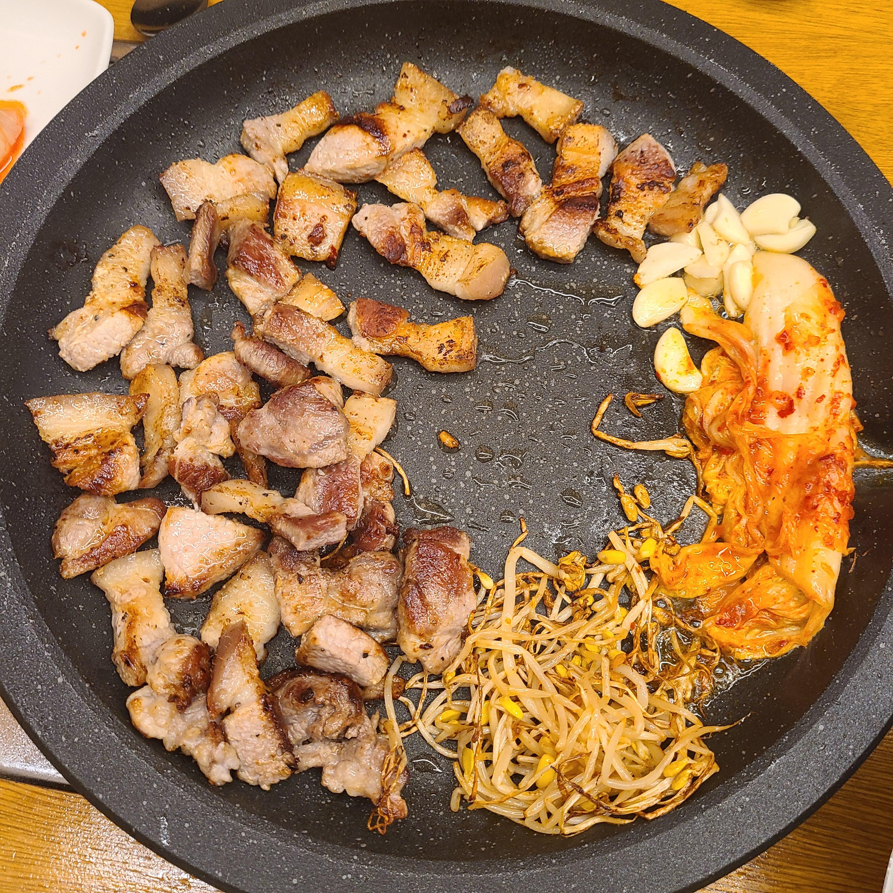 생고기에서 적당한 기름기가 빠지면 콩나물, 마늘, 양파, 김치를 올려서 같이 구워줘야죠.