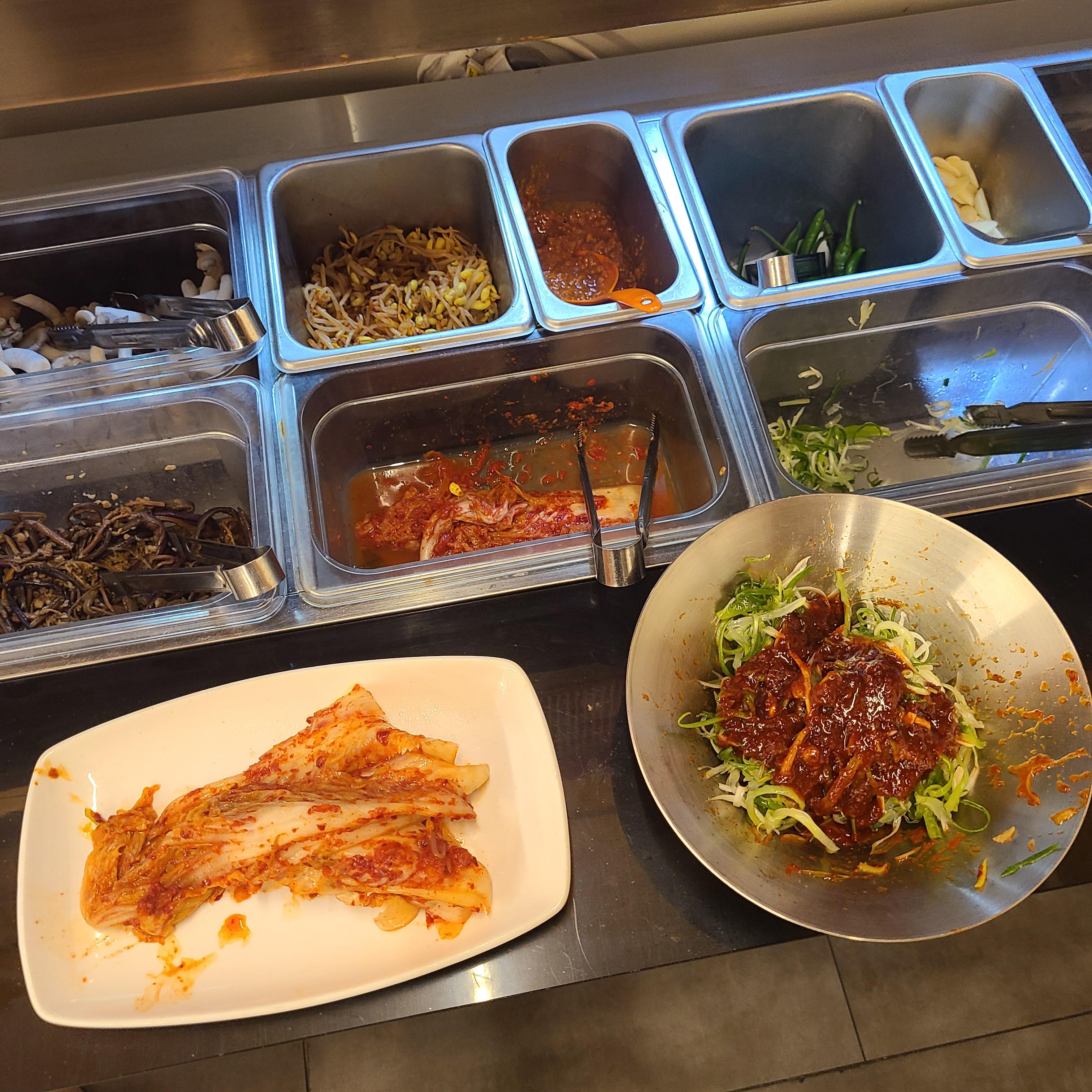 콩나물, 마늘, 양파, 김치는 셀프바에서 추가로 담아오시면 돼요.