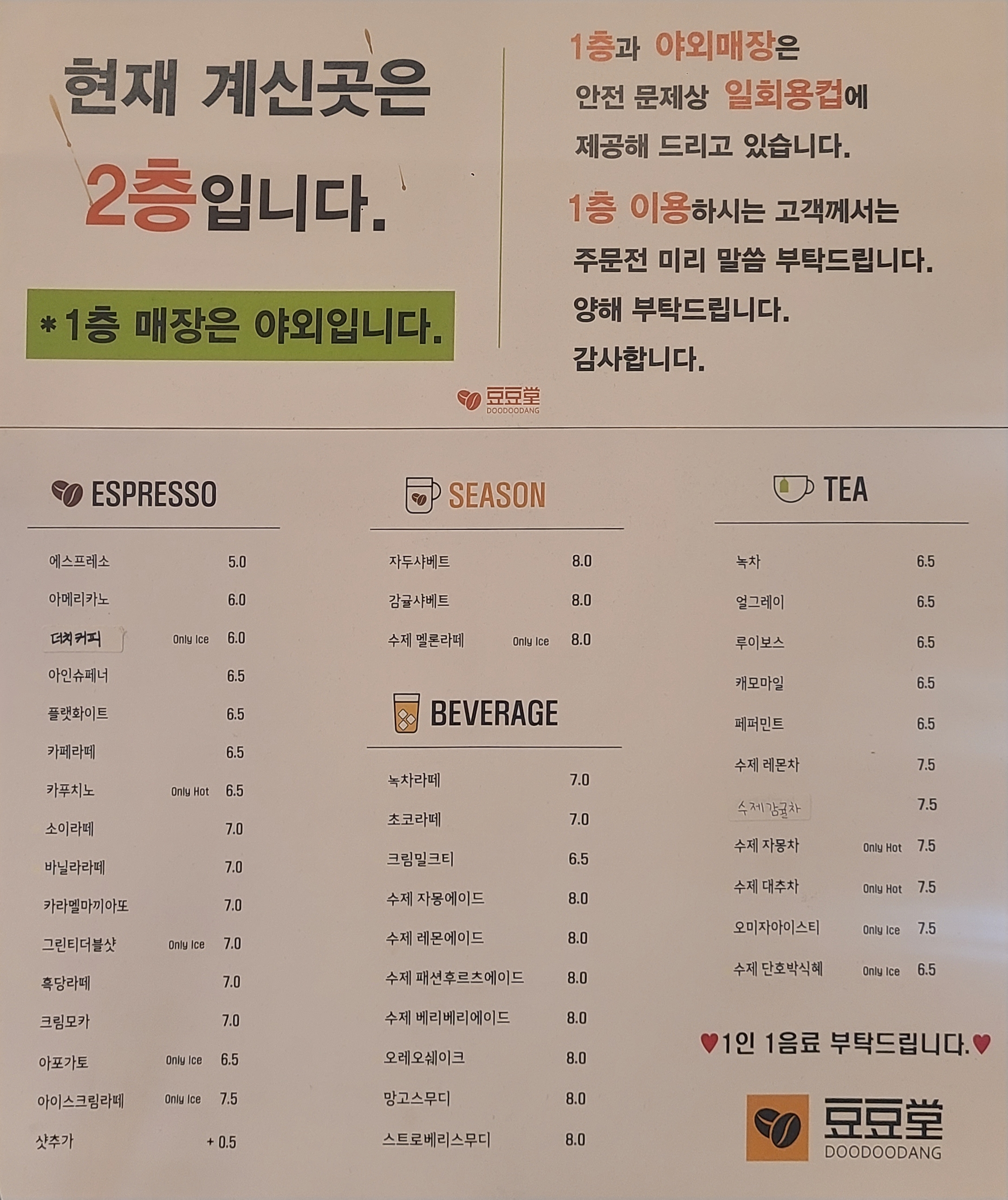 1층 및 야외매장을 이용하는 분들은 주문 전 미리 말씀하시면 좋을 것 같아요.
