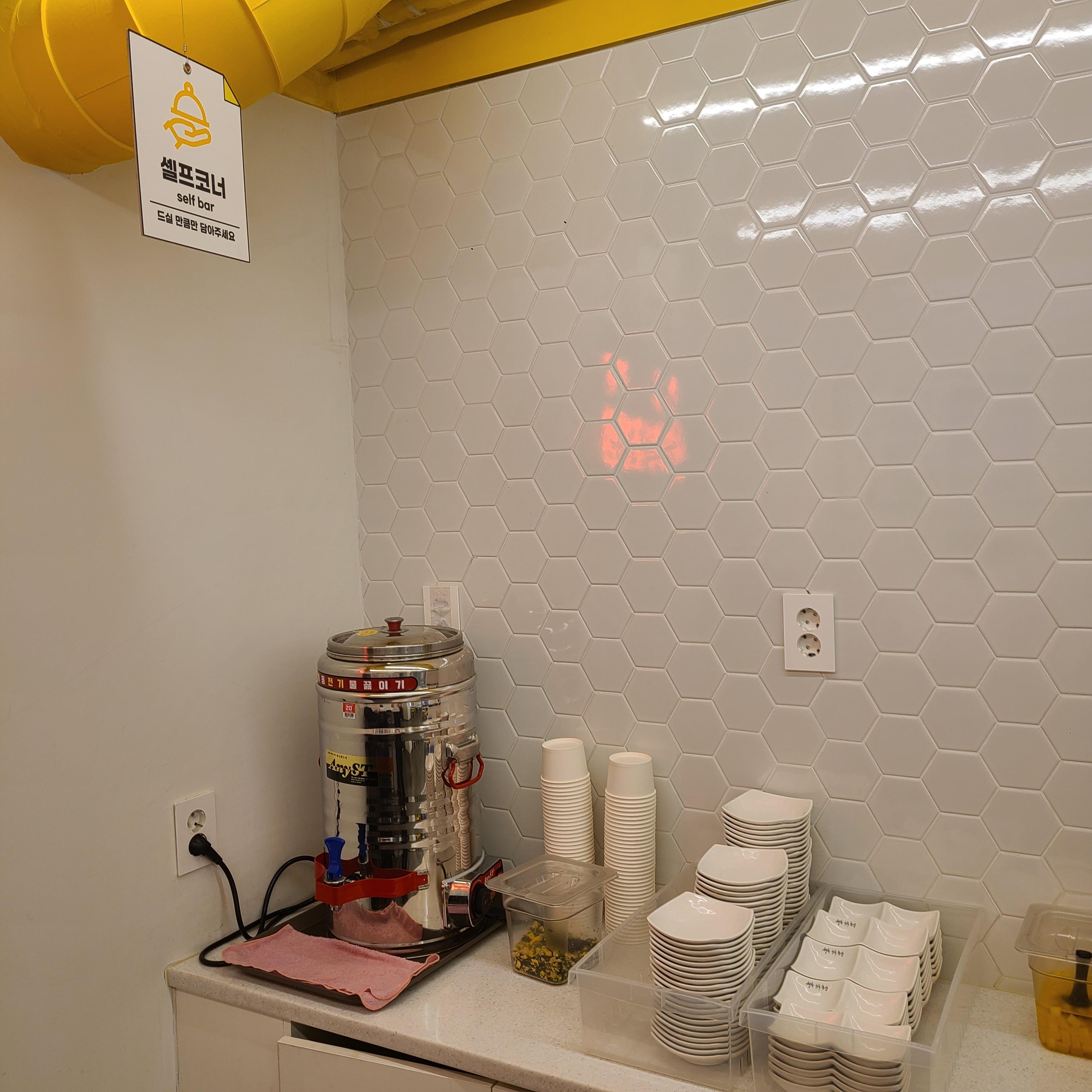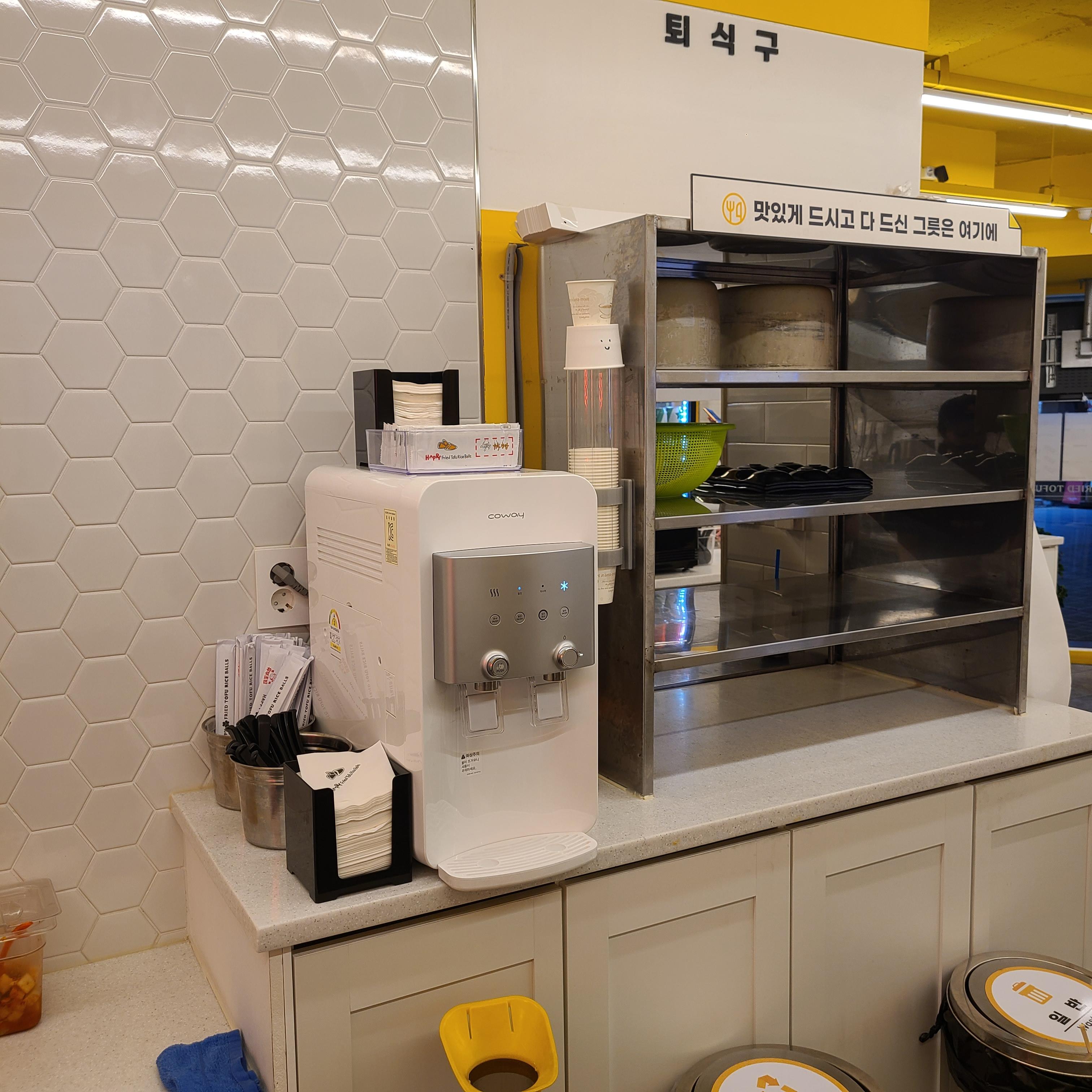 오른쪽으론 정수기와 퇴식구, 쓰레기통이 있었어요.