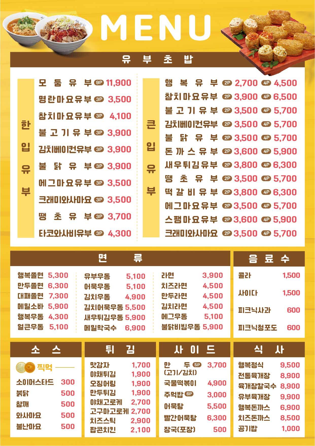 모둠유부는 아래에 놓은 모든 메뉴를 1개씩 주는겁니다. (명란마요 , 참치마요 , 불고기 , 김치베이컨 , 불닭 , 에그마요 , 크래미와사비 , 땡초 , 타코와사비 )