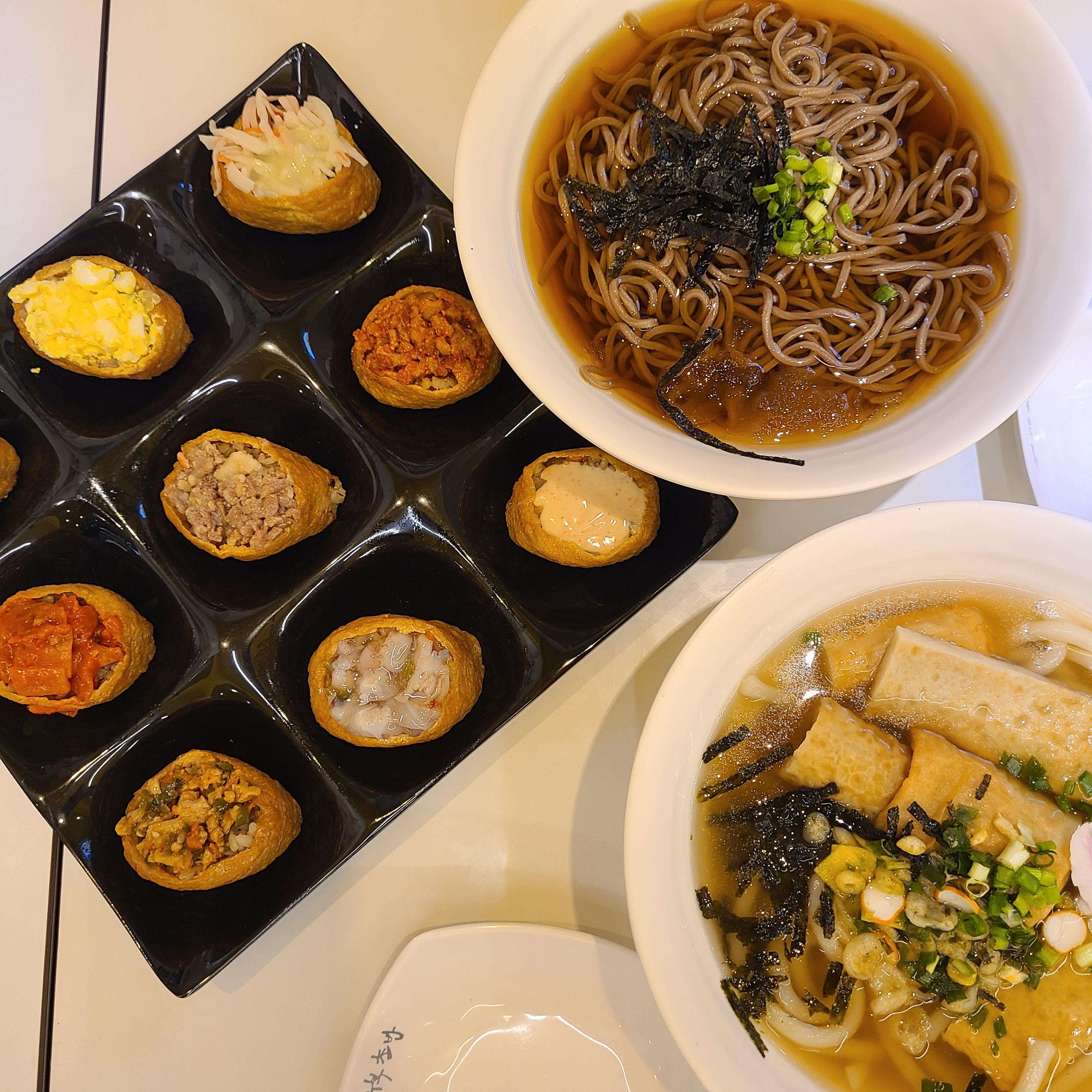 유부초밥집은 처음이라, 다양하게 먹을 수 있는 모둠유부와, 그에 어울릴법한 소바와 우동를 주문했습니다.