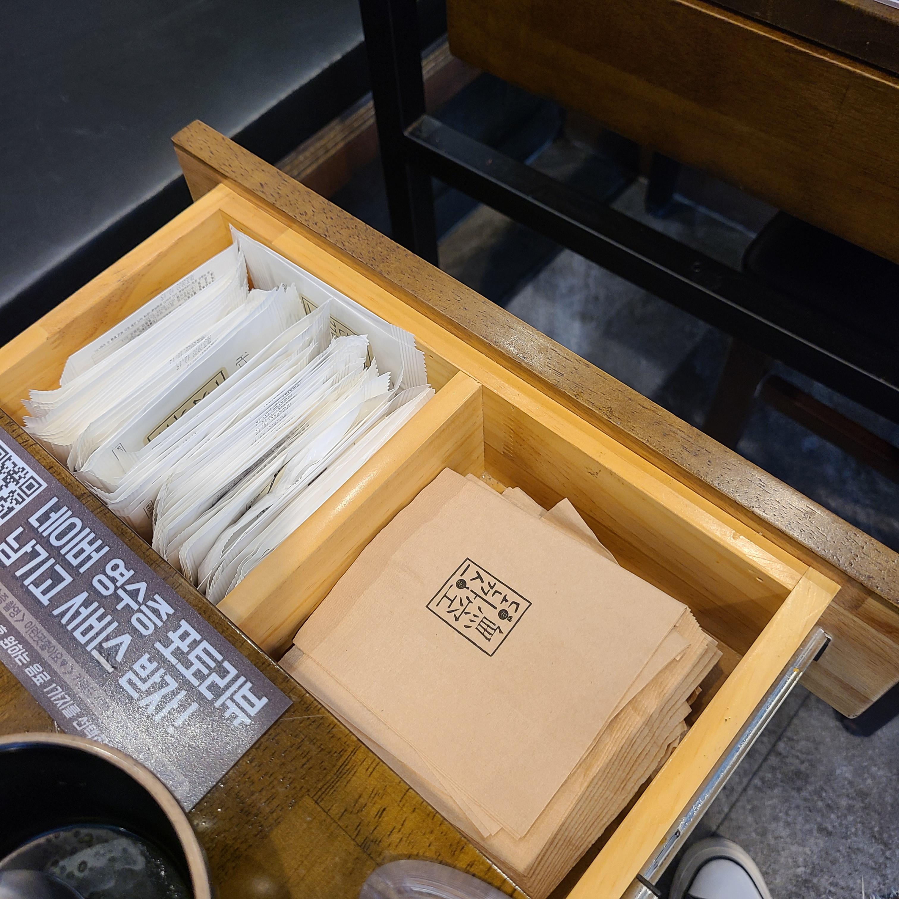 책상 옆 서랍엔 물티슈와 냅킨이 있으므로 식사중간에 편하게 꺼내쓰세요 :)
