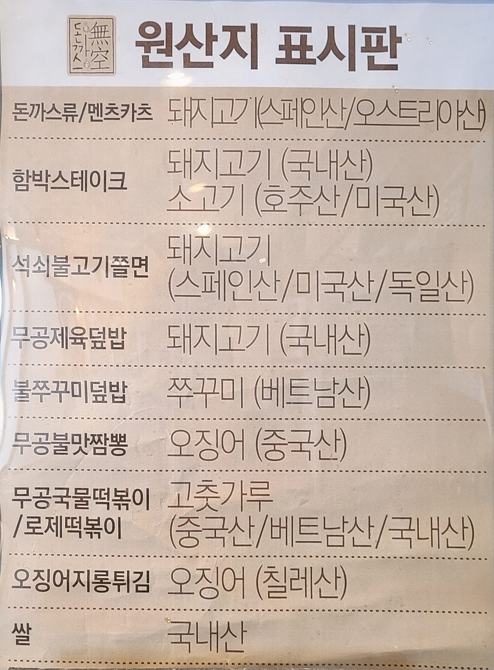 불당동 무공돈까스 메뉴입니다.