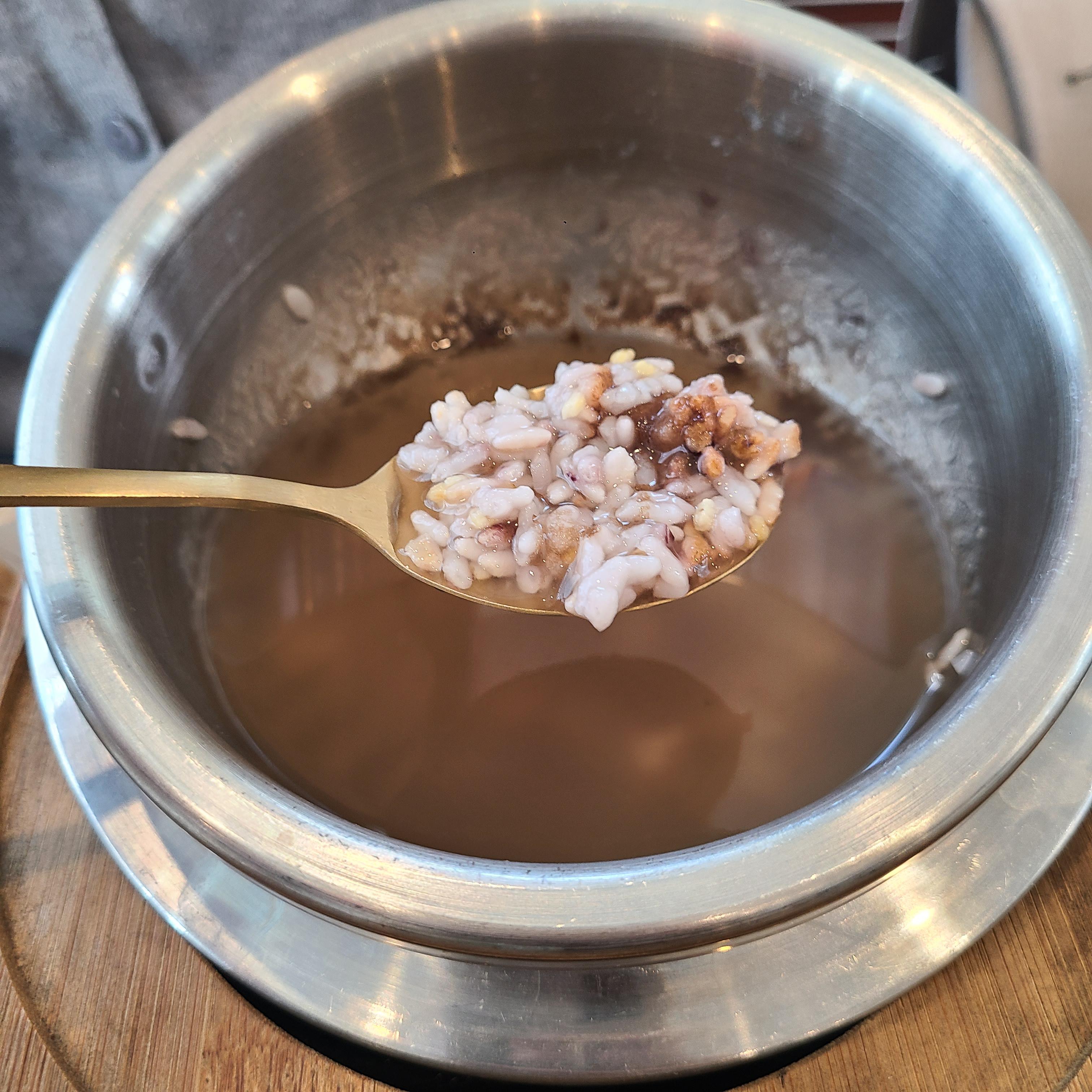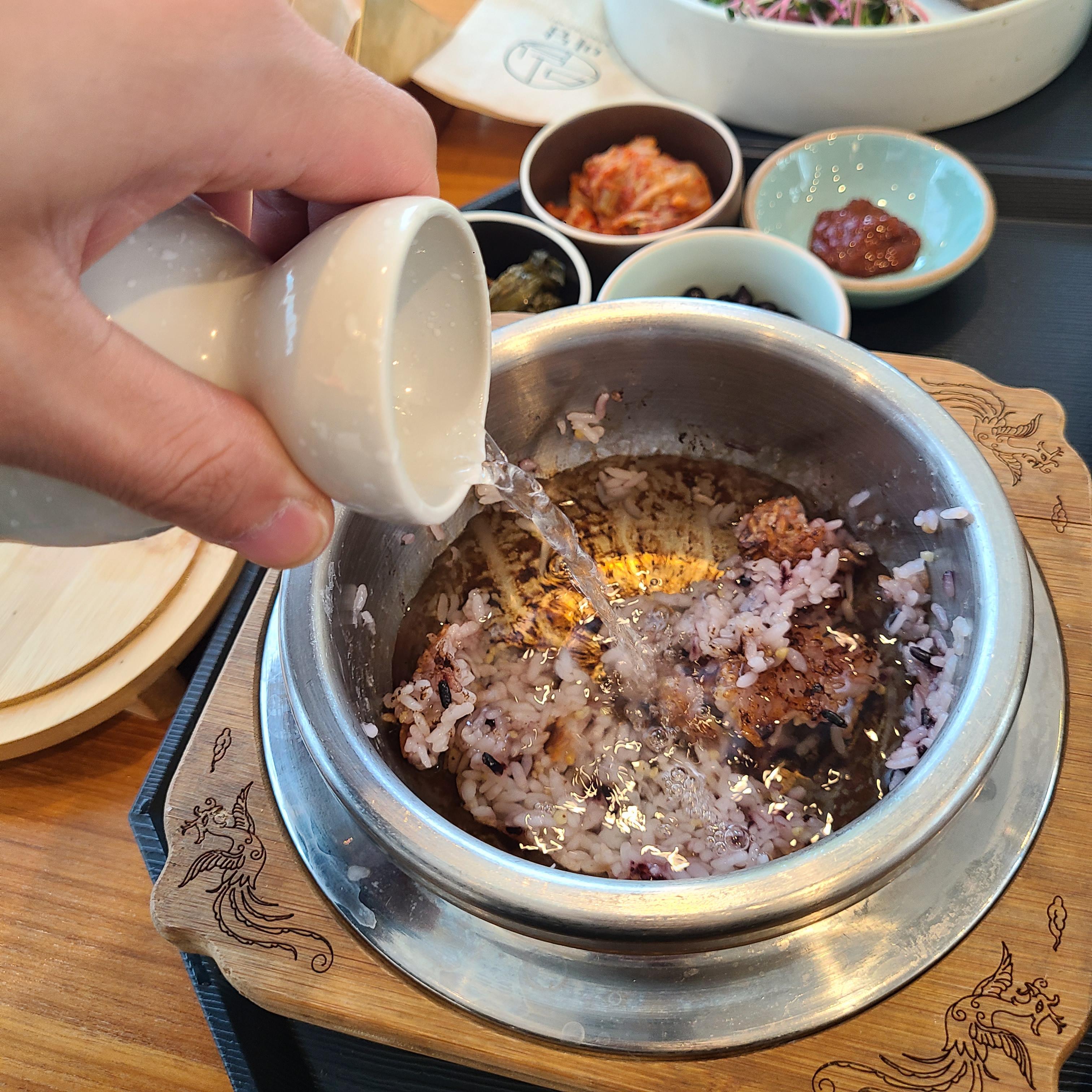 솥에 있는 밥은 누룽지부분을 빼고 밥그릇에 담고, 따듯한 물을 부어줍니다.