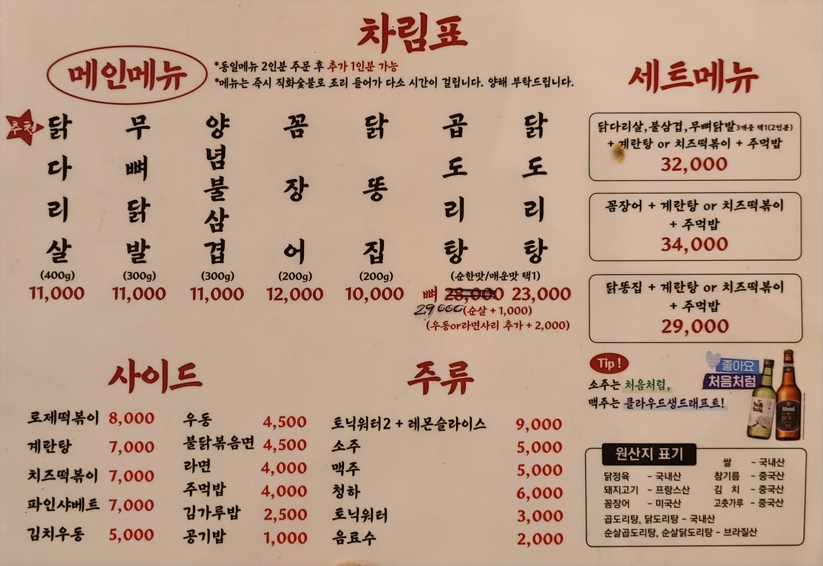 대표적인 메뉴가 닭다리살, 무뼈닭발, 양념불삼겹 정도였구요.