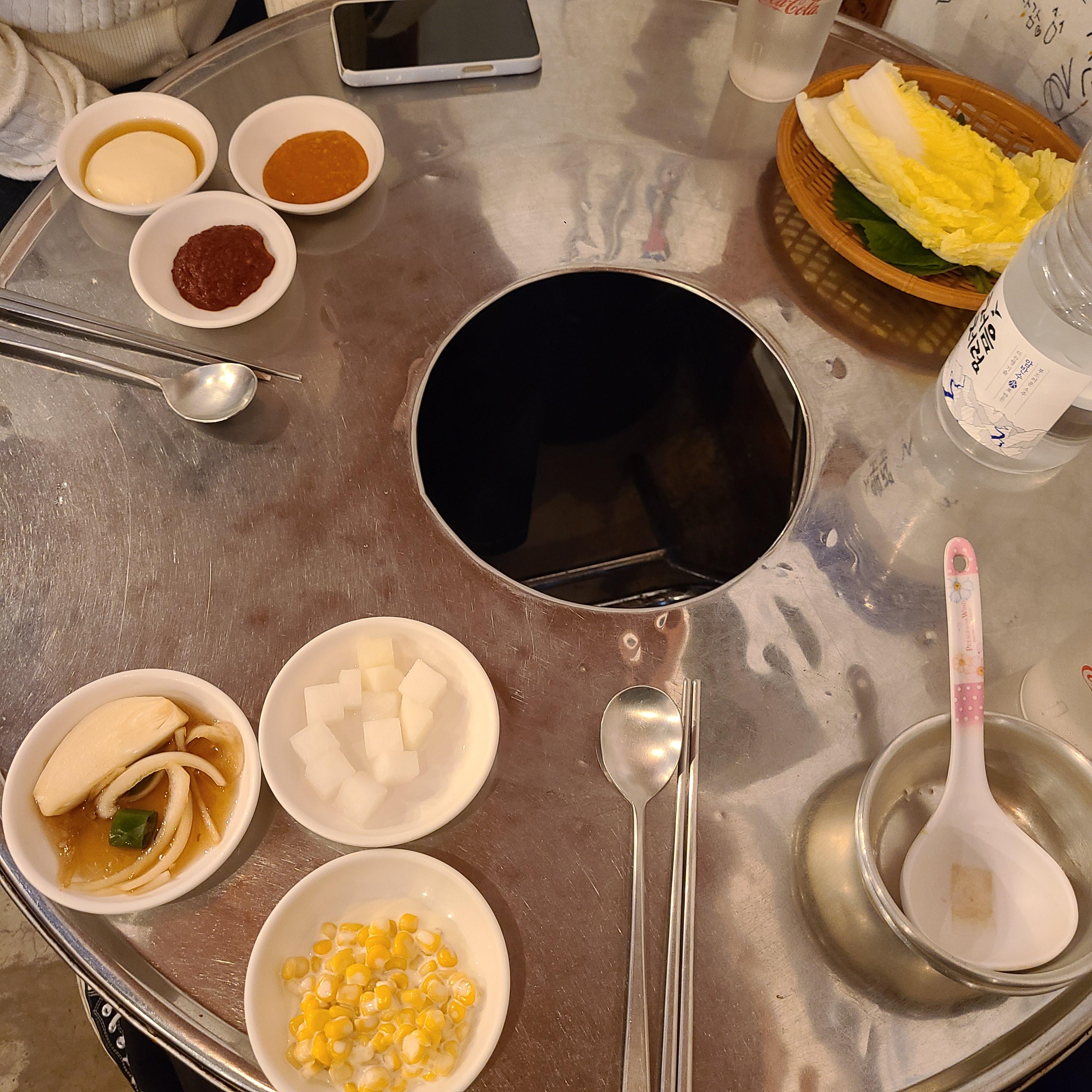 3종류의 소스, 고기와 먹는 쌈채소, 스위트콘을 포함한 밑반찬이죠.