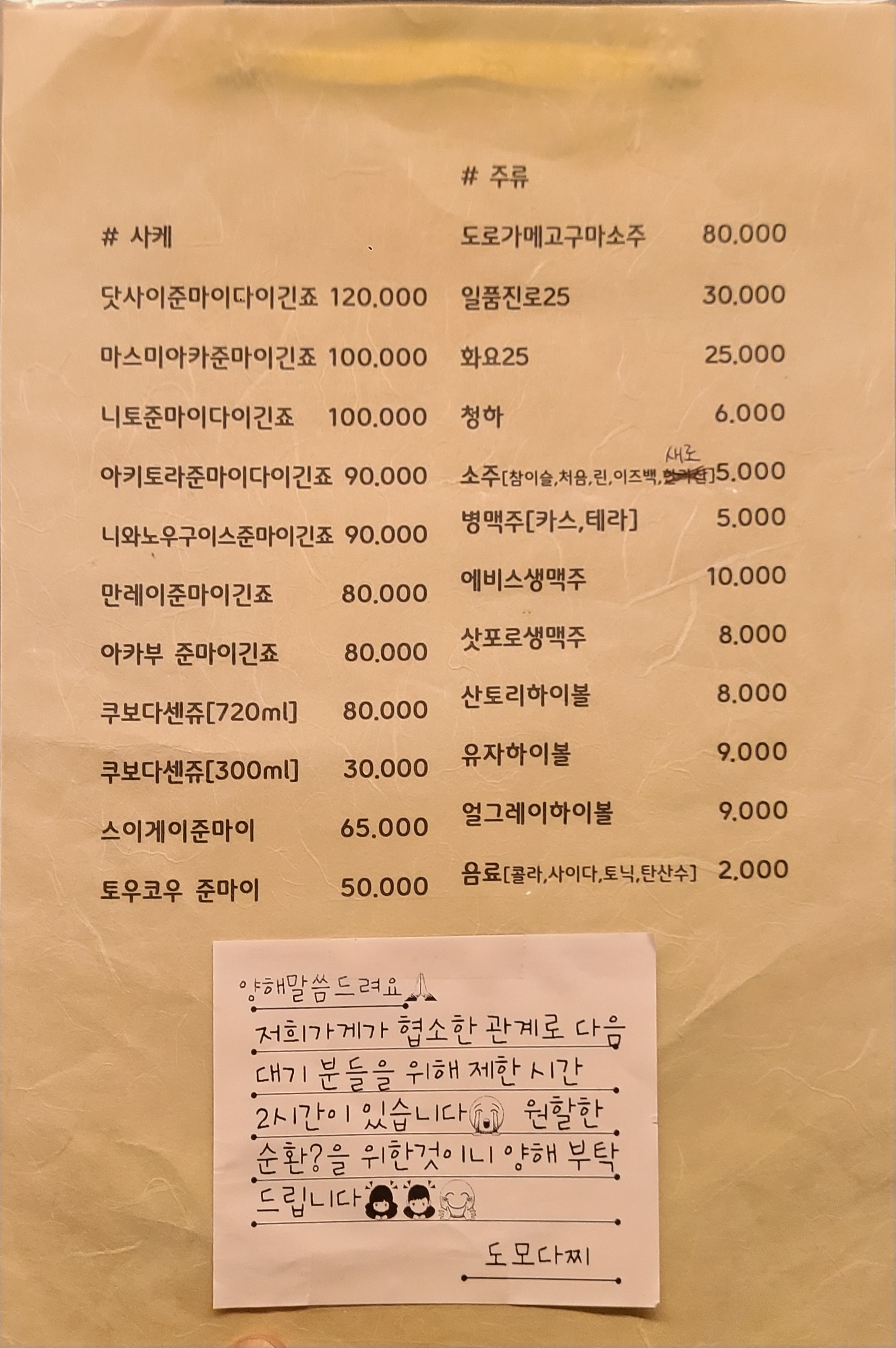 가격은 좀 있지만, 일본식 술집을 제대로 방문하고싶다면, 불당동 도모다찌를 추천합니다.
