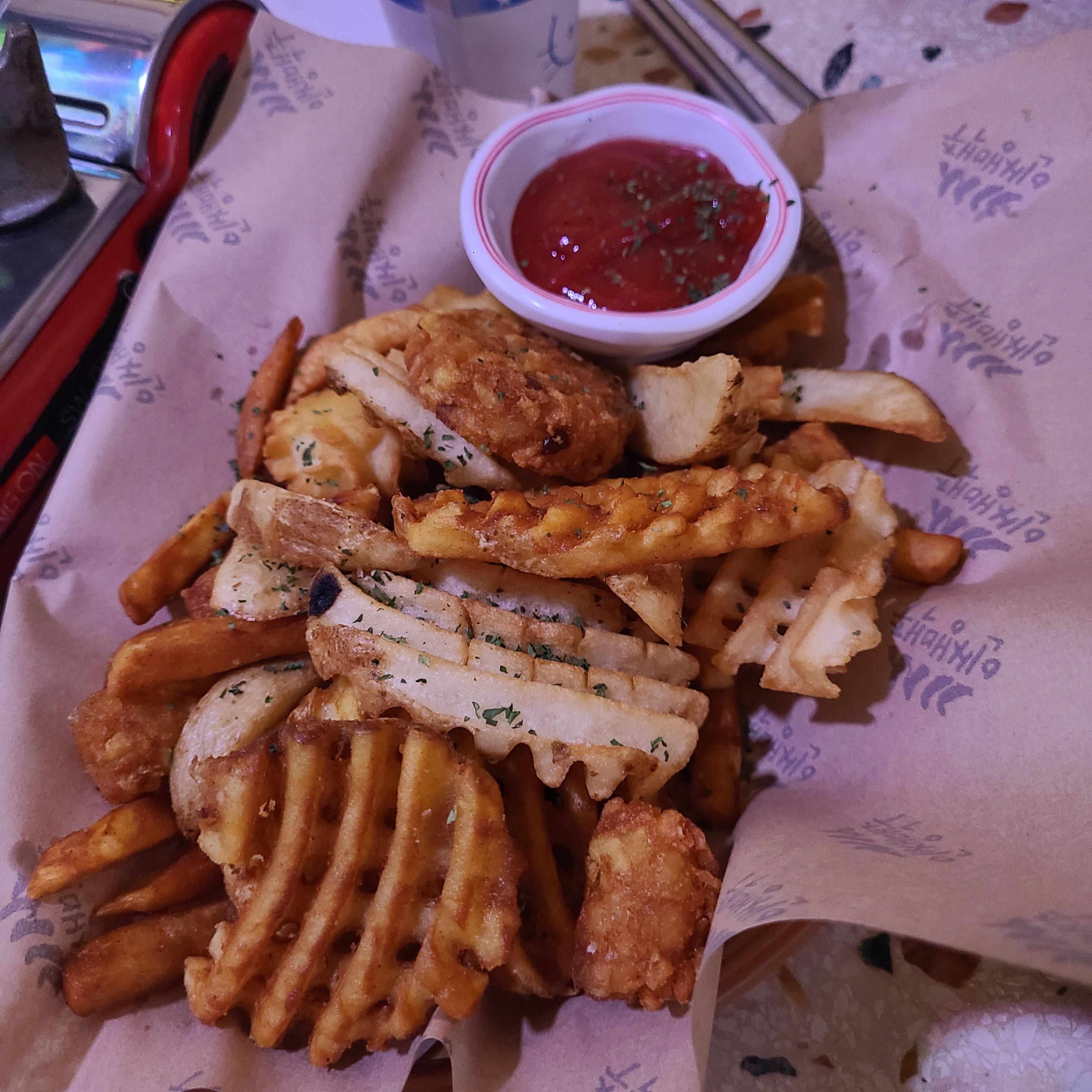 가운데 사진은 모듬감자튀김 , 오른쪽 사진은 파닭꼬치입니다.