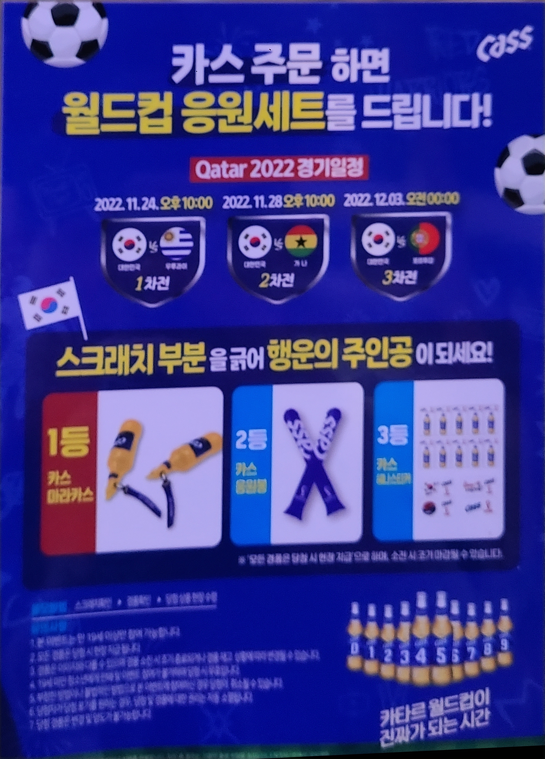 아참, 카스(병)을 주문하면 이렇게 복권을 긁어 상품을 나눠주는 이벤트를 하더라구요.