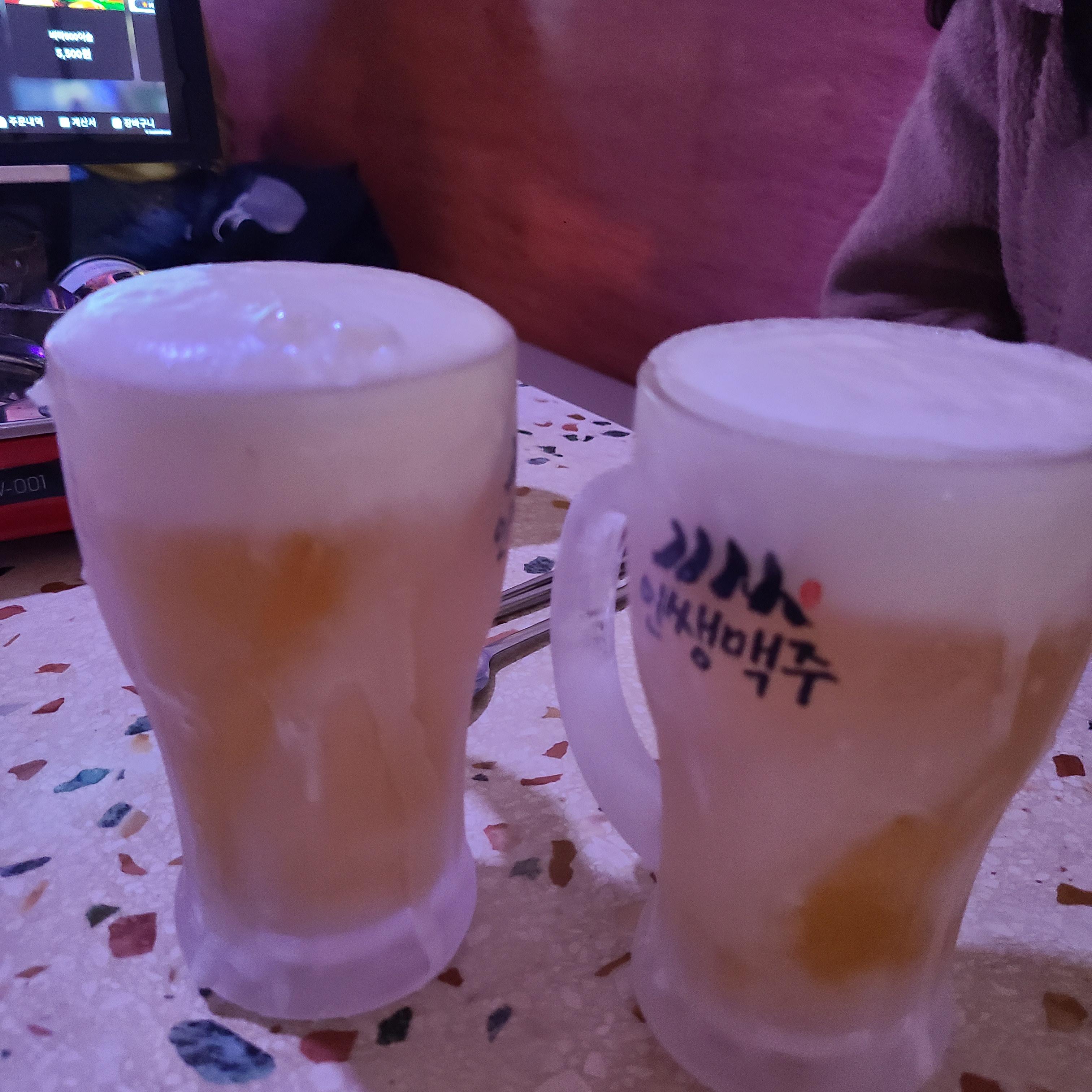 시원한 얼음잔에 살얼음이 떠있는 생맥주! 넘치게끔 따라서 가져다주십니다.