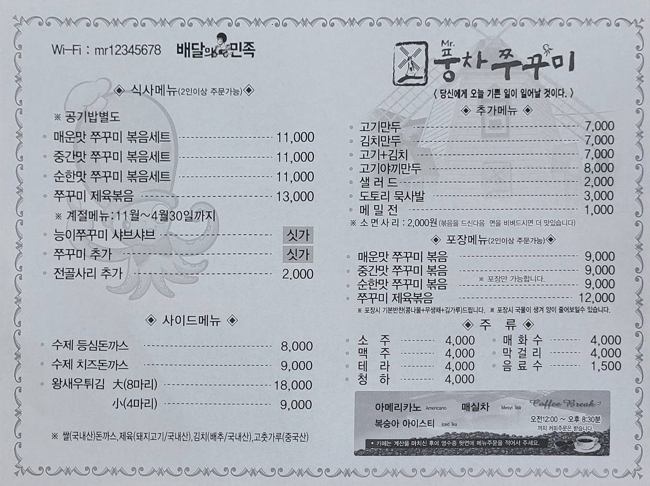 메뉴판엔 와이파이 비밀번호가 있네요.