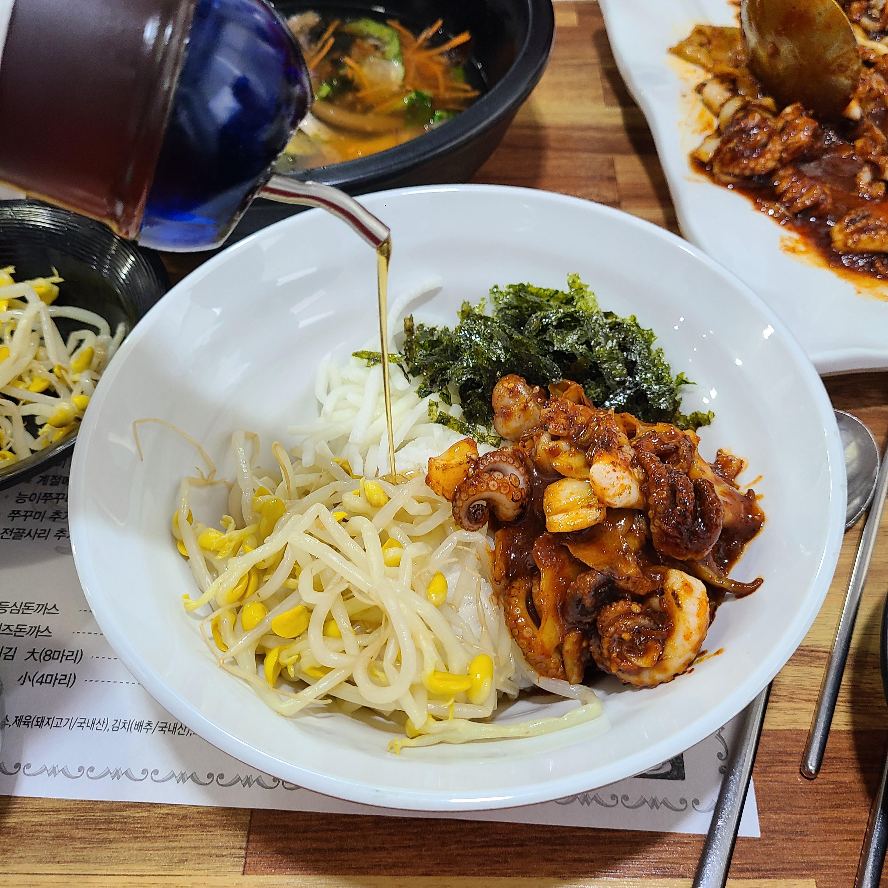 공기밥(별도주문)에 콩나물 , 무생채 , 김가루 , 쭈꾸미에 참기름을 두스푼정도 넣고 비비면 한끼 뚝딱이죠.