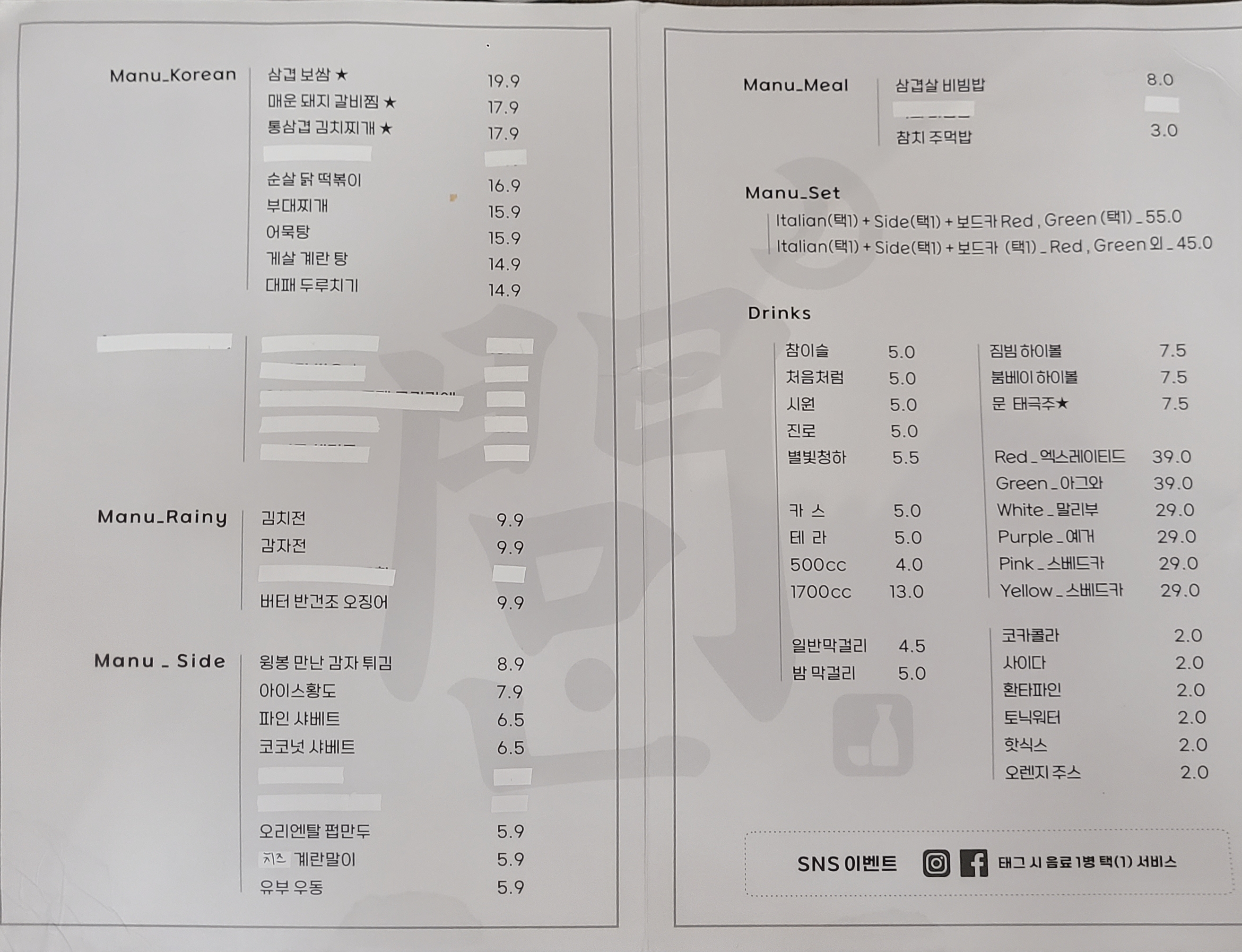 제일 잘 나가는 메뉴를 여쭤봤는데, 별이 그려져있는 "삼겹 보쌈", "매운 돼지 갈비찜", "통삼겹 김치찌개"를 추천해주셨습니다.