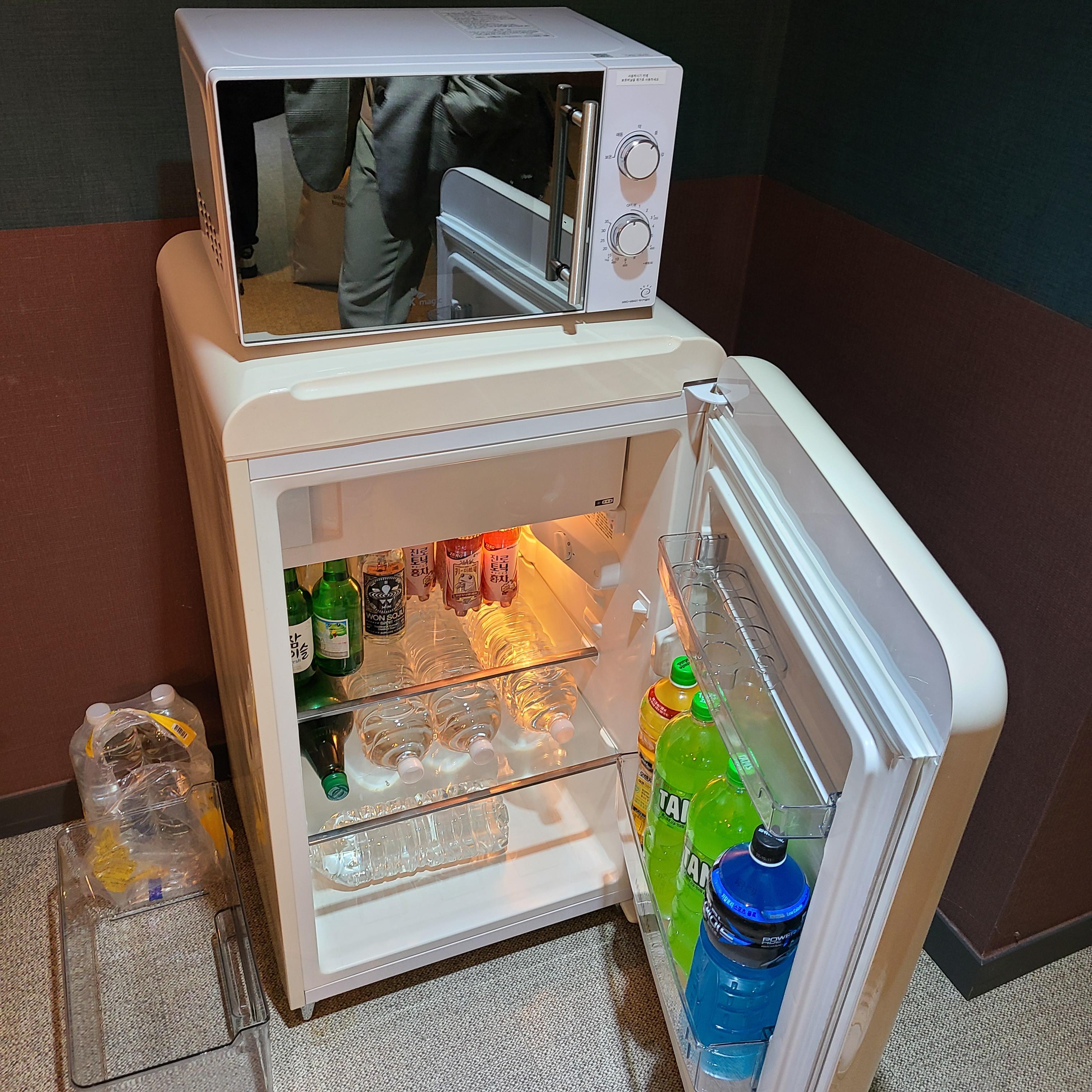 전자레인지 , 에어컨(냉난방) , 냉장고 , 옷걸이가 한 쪽으로 놓여있습니다.