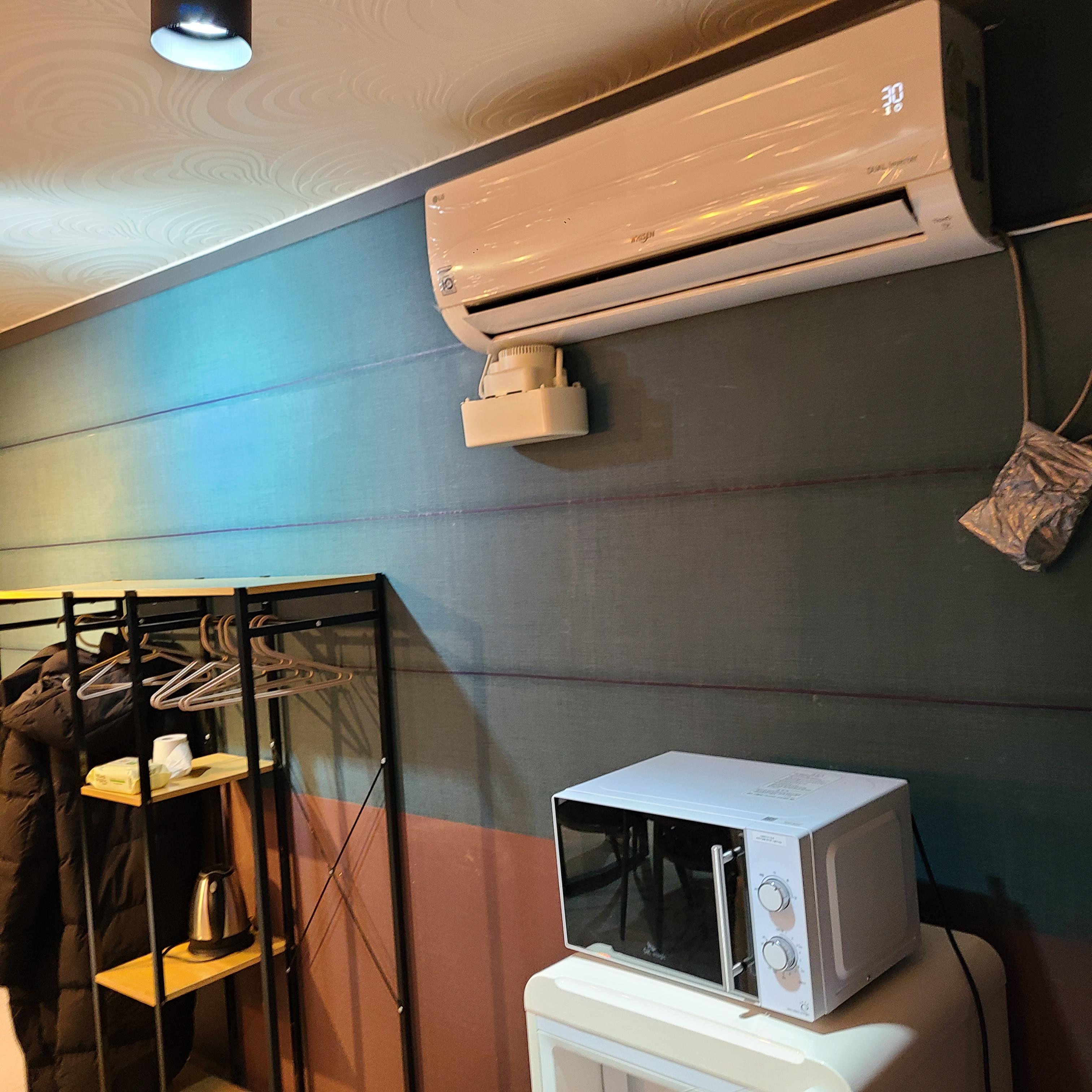 전자레인지 , 에어컨(냉난방) , 냉장고 , 옷걸이가 한 쪽으로 놓여있습니다.